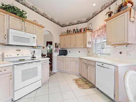 RidgeMont 2 bedroom / 2 Bath / Den model on 1-floor in Gated Community with newer HVAC and water heater PLUS a 200+ SF South-Facing screened lanai, located just 0.4 miles from High Vista's private clubhouse and outdoor amenity center. Charming portico entry with overhead sunburst window and full-view screen door enters the great room with cathedral ceiling and a wall of patio windows to the lanai. Eat-in kitchen in front of house has Corian countertops, tile-on-point backsplash, crown-molded cabinets, white appliances and large closet pantry. Installed storage cabinets over washer/dryer in corridor laundry. Primary en suite bedroom has french door access to lanai with retractable screen door, 13x6 walk-in-closet, dual sink vanity, soaking tub, linen closet and shower. Guest bedroom and den share a full bath and large linen closet in this split bedroom floor plan. 2-car garage has insulated garage door with keypad entry, utility sink, installed cabinets, workbench, ceiling fan and pull-down ladder access to attic. Freezer & refrigerator in garage and RING doorbell are not included. New water heater installed 2024; new A/C air handler installed 10/2023; exterior painted 2022; HVAC replaced 2018; newer smoke detectors. Sold As-Is. Ridgewood Lakes is a golf cart friendly community. $230 monthly High Vista HOA fee includes Spectrum internet and basic cable TV with 2 cable boxes, lawn mowing and exclusive access to resident-owned 12,000 SF private clubhouse and amenities. $425 semi-annual Ridgewood Lakes HOA fee provides 24x7 staffed security gate and master association-owned private road maintenance. Adjacent to 18-hole White Heron Golf Club with restaurant, privately owned and open to the public. High Vista is a 55+ community with outdoor heated pool and spa, fitness center, library, pub & many organized activities. Pickle ball, tennis, bocce and shuffleboard courts. Miles of biking and walking trails within Ridgewood Lakes gated community. Shopping, Disney, Universal, Orlando & Central FL entertainment nearby, easy access to I-4, medical facilities, airports & Sunrail Station. Advent Health hospital is 3 miles away.
