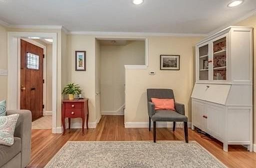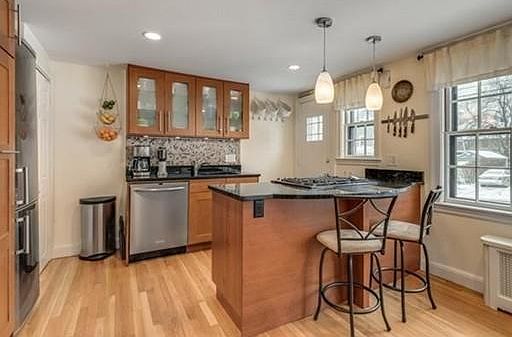Walk to Winchester center and the commuter rail from this lovely 2 bedroom, 1 bathroom condo. The lovingly renovated first level boasts a living room with wood burning fireplace. This bright and cheery room has wonderful views of the Winchester Green center courtyard. Make your way to the kitchen that will wow you with its granite counters, stainless steel appliances and eat in area. The second level is where you'll find the full bathroom and both bedrooms. The unfinished attic space will hold all of your extra items. The basement has your own modern washer and dryer. One car parking deeded at your back door. Several new restaurants as well as the Fells conservation area are yours to enjoy. A nearly perfect blend of city and suburbs . Tenant to pay one full month fee to be split with both brokers.