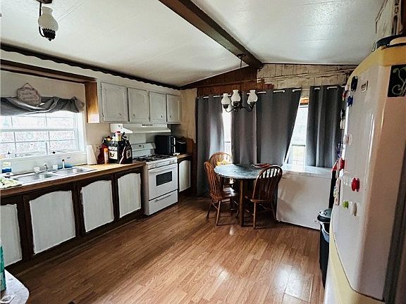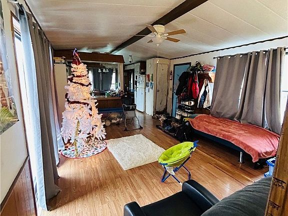 Inside, you’ll find high ceilings, a clean and open layout, and two well-sized bedrooms with one full bath. The home features propane heat, propane hot water, and a gas stove. Appliances included in the sale are the refrigerator, microwave, washer and dryer, and an AC window unit. Basic furnishings will also remain, including a couch, coffee table, daybed, king bed and mattress, dining table and chairs, and window curtains, making this an easy and affordable move-in option.
