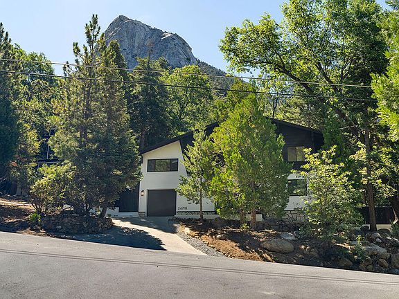 Mountain Peaks Chalet, an extraordinary, fully modernized mountain cabin nestled along a serene seasonal creek with breathtaking views of Tahquitz Rock (Lily Rock) and Suicide Rock through dramatic clerestory windows. No detail was overlooked in this complete hillside transformation: New hickory wood flooring, modern lighting, wood-burning fireplace, and a stunning chef's kitchen with custom cabinetry, quartz countertops, and stainless-steel appliances.Both bedrooms are conveniently located on the main level, including a custom primary suite, plus direct access to the finished garage featuring an EV charger, built-in cabinetry, fridge, and sink. Upstairs, the open-concept living area dazzles with forest views on all sides with wood-burning high efficiency stove w/catalytic converter for near-zero emissions, a spacious balcony, flexible den/office (or additional sleeping space), and a stylish new guest bath.Enjoy year-round comfort with 5 new electric mini-split heating/AC units, all-new windows and doors with custom shades (some remote-controlled), fresh interior/exterior paint, a new roof, and refreshed landscaping with new rock and mulch. Ideally situated close to town and scenic hiking trails, Mountain Peaks Chalet is the perfect blend of modern luxury and timeless mountain charm.