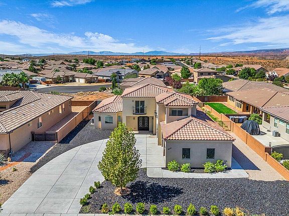 This stunning Mediterranean style home in Dixie Springs offers incredible views of Pine Valley Mountain. The spacious layout features a large primary suite with a spa inspired ensuite complete with a steam shower and vintage freestanding tub for the ultimate retreat. Upstairs, a second story deck captures the mountain vistas and provides the perfect space to relax or entertain. Thoughtful details are found throughout including an iron front door, warm pine interior doors, and a charming pergola. Modern comfort is ensured with 3 zoned units on Dixie Power.