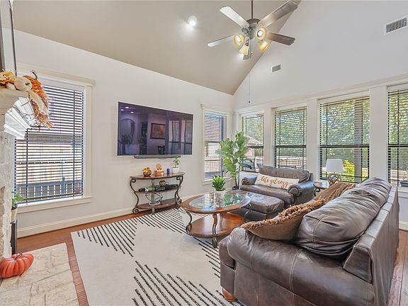 The inviting entry opens to a private study featuring one side of a beautiful stone, two-sided fireplace shared with a spacious living room. A formal dining room with wood floors and elegant detailing provides the perfect setting for entertaining. The wood flooring continues through the study, dining and living areas. An updated HVAC system adds peace of mind and energy efficiency.