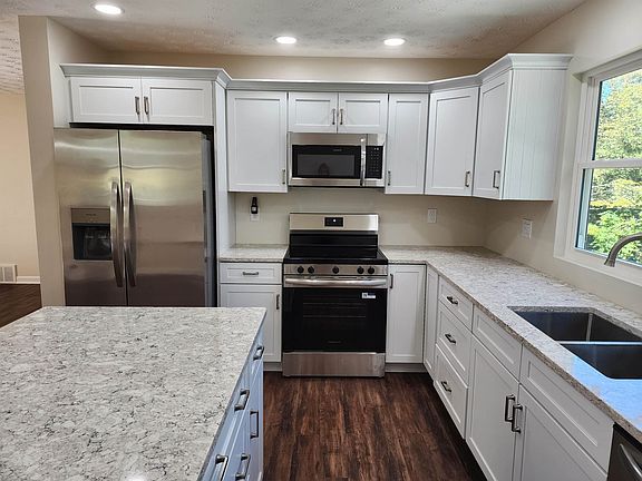 This stunning 4-Bedroom 3- Bath home has been fully updated from top to bottom inside and out, new siding, windows, doors, concrete driveway plus deck and patio. Step inside to an open modern layout with luxury vinyl plank flooring throughout the living area and kitchen. The chef's kitchen shines with upgraded cabinets and Island, slide out drawers, stainless steel look appliances, and beautiful finishes. Each of the 3 brand-new bathrooms includes Bluetooth sound for a touch of luxury. Relax by the cozy fireplace in the large gathering room with room for plenty of guest or unwind in the home's private setting surrounded by nature. Move-in ready and looks to impress- this one has it all.