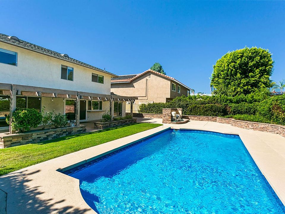 Available November 2nd! Discover this stunning five-bedroom, three-bathroom home, perfect for families and entertaining. The interior features warm, neutral tones, creating an inviting atmosphere from the moment you step inside. The newer kitchen is a chef's dream, complete with crisp white cabinets, ample storage, and included appliances. One bedroom is conveniently located downstairs, with four additional bedrooms upstairs, providing plenty of space for everyone. The backyard is a true oasis, featuring a large covered patio ideal for outdoor dining, an open lawn area for play, and a beautiful pool with custom safety fencingperfect for cooling off on a warm day. Situated on a private cul-de-sac, this home offers a peaceful retreat while still being close to a variety of shops and the 5 Freeway. 1.