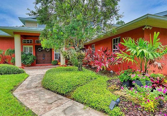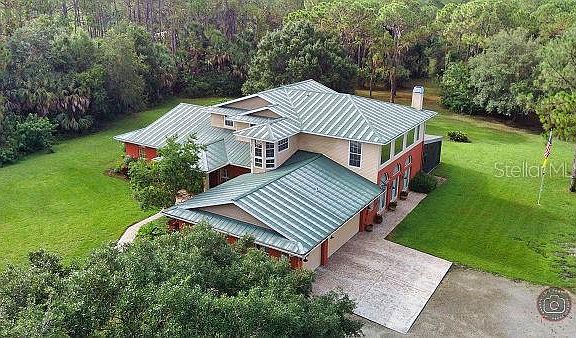 Your search has ended! If you have been looking for that perfect home on ACREAGE, yet conveniently located close to all kinds of shopping, restaurants, business centers, and area beaches, this is it! Set on 5 acres where peace and quiet abound, this spacious custom built home has over 3700 square feet of living area, plus a 3 car side entry garage. Entering through the private gated entrance, you'll be greeted by the tall old oak trees along the circular drive. Double doors welcome you into the spacious living and dining area, with the kitchen conveniently located around the corner. Wood cabinetry & ample solid surface countertops provide plenty of room for all of the cooks in the family to work together. Appliances include: a brand new stainless Frigidaire built in microwave, new convection oven, and new LG French door refrigerator, plus Jennaire cooktop and Kitchen Aide Dishwasher. Breakfast bar and Breakfast Nook are both great choices to enjoy morning coffee or evening dinner. The favorite room in the house is bound to be the HUGE FAMILY ROOM, with wood burning coral stone fireplace, 25' SOARING CEILINGS, and 3 sets of French doors looking out to the LAKE. The master bedroom suite checks all the boxes, with two walk in closets, and luxurious master bath with both garden tub, ROMAN SHOWER, separate water heater, and a double basin vanity. The 5th bedroom or office, with new wood flooring, adjoins the master suite, and is multi functional. Half bath is conveniently located just off the main living area. Laundry room has all of the storage you need, with plenty of built in cabinetry and utility tub, plus new washer and dryer. Upstairs you will find the other 3 guest bedrooms and two full bathrooms.(One of the baths is a Jack and Jill bath, serving two of the bedrooms.) The loft area provides a quiet place to read, and overlooks the Family room. The Large (35' x 20') Screened and tiled Lanai w/cedar planked ceiling is just off the breakfast nook, providing a view of both the lake and backyard. Home features a long lasting metal roof, 3 zoned AC system, (BRAND NEW DOWNSTAIRS AIR CONDITIONING SYSTEM) BRAND NEW WHOLE HOUSE R.O. SYSTEM, new STAINLESS STEEL WELL SYSTEM, Plantation shutters, sprinkler system on well, and so much more! NEW 10 X 20 STORAGE UNIT - PERFECT FOR A "SHE SHED!" No deed restrictions or Homeowner association dues, and not in a designated Flood zone. Plenty of room for storage of Boats, RV's, ATV's or whatever you have. Horses welcome.