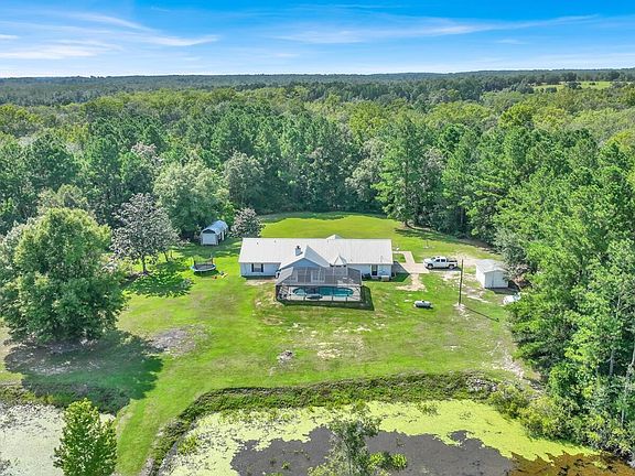 Your private oasis on an expansive 35 acres, complete with caged pool looking out to your very own stocked fishing pond! You won't ever want to leave. This large 4-bed, 3-bath well-maintained open floor plan ranch home boasts large living room, and additional living room which can also serve as a formal dining room. Generously-sized kitchen with peninsula breakfast bar. The bathroom in bedroom-2, at the back right at the end of the hall, has a huge curbless ADA tiled shower. Bedroom-1 (master) at the back left at the end of the hall, has it's own bathroom, with shower/tile combo, and a large walk-in closet. The large Florida room/patio has plenty of room for lots of friends and family, large enough for furniture, plus all your pool fun floaties and other toys. The outside of this home is AMAZING! Completely private with SO much space to run and play. Several storage buildings plus an RV/boat storage. The property is partially fenced, perfect for livestock enthusiasts. Recent upgrades include a new AC unit in 2022 and a metal roof in 2020. You'll love the brand-new HEATED Gunite pool, fully enclosed, perfect for year-round relaxation and fun. Additional features include a convenient pole barn with a 30 amp RV hookup, catering to your storage and travel needs. Located just 15 minutes from Chipley and a short 25-minute drive to Panama City, this home offers both serenity and accessibility. Don't miss out on this fantastic opportunity - schedule a showing Right Now!