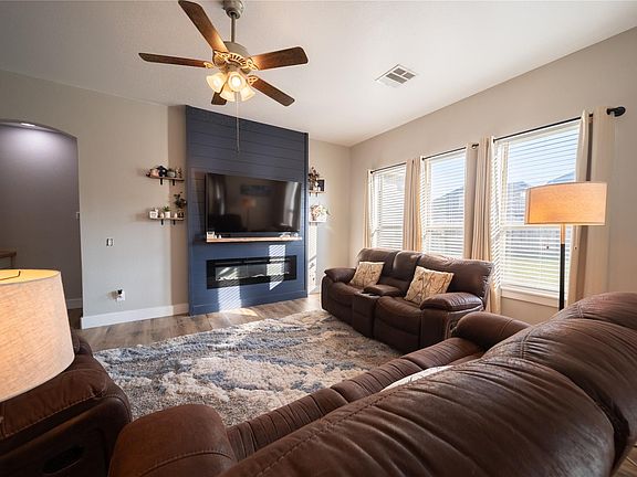 Custom fireplace built-insUpgraded lvp flooringCovered patioEye-catching kitchenLarge walk-in closetMassive double showerGorgeous black stone backsplash