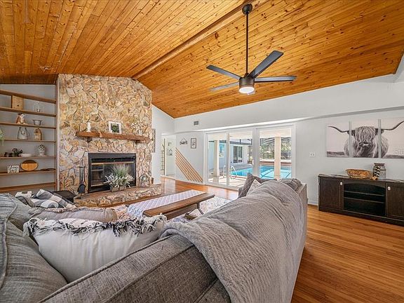Crystal-clear inground poolCourtyard style layoutPrivate courtyard-style poolPeaceful tree-shaded settingStunning stone fireplaceVaulted tongue-and-groove wood ceilingStainless steel appliances