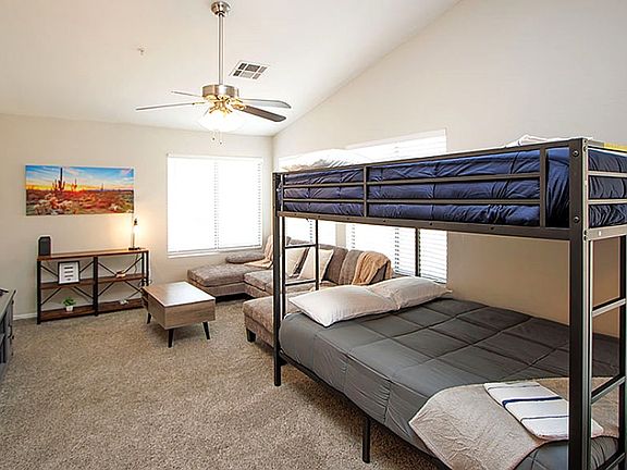 Located in North Scottsdale, this home boasts 4 bedrooms and 2.5 bathrooms. The home spans 2350 square feet and includes a 2-car garage. It comfortably sleeps 12 people but could accommodate more. The backyard is perfect for entertaining, with a 6-person hot tub, a pool, propane BBQ, and a sitting area. Please note that the pool is not heated but could be for an additional fee of $50 per day. The split floor plan is amazing, and renters can enjoy Roku streaming on 3 separate TVs, a pool table, foosball table, life-size games outside and board games inside. The home is located near well-ranked schools and is just minutes away from numerous attractions, including Downtown Scottsdale, Kierland Commons, and various golf courses. It is also conveniently located near events such as MLB Spring Training Baseball.