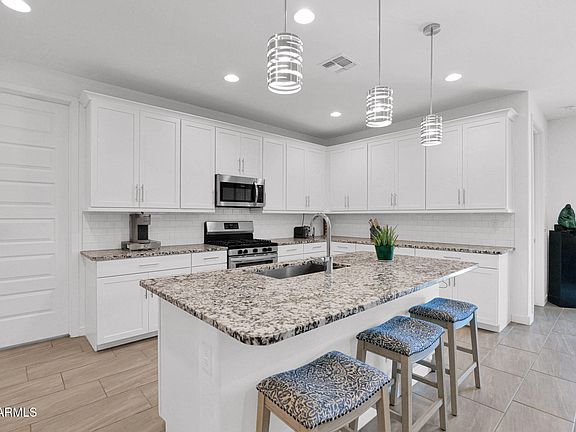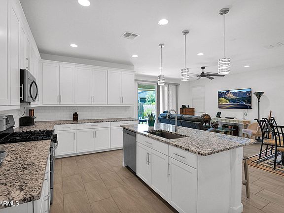 24767 N 171ST DR, Surprise, AZ 85387 - in Asante Heritage, Active Adult 55+ community, do not miss out on this highly upgraded Dawn floorplan, 2 bedroom + Den, 2 bath, Granite kitchen countertops, 48 inch cabinets and full tile backsplash throughout kitchen, 12 x 24 tile throughout home and 4 inch baseboards, 8 foot doors, extra lights, speaker pre-wire and fully landscaped backyard. Thousands of $$ spent on upgrades inside and out. No comparison to bare bones new builds down the street. Close proximity to Pickleball courts and Asante Heritage Club. Solar lease makes electric almost free in this energy efficient home. Amenities galore - pool, Bocce ball, resort-style pool and spa, nine-hole lighted putting course & modern fitness center.