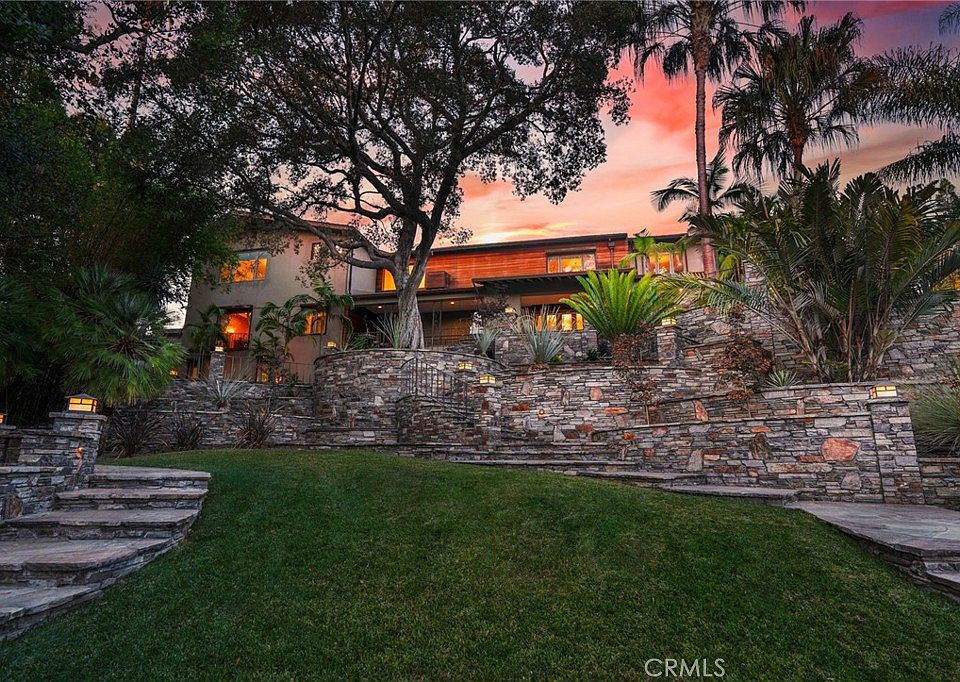 Originally built in 1927, this one-of-a-kind San Marino estate elegantly sits on over an acre of hilltop land with scenic views. The expansive terraced grounds are surrounded by gorgeous, matured trees, gardens and landscaping. A graceful stone walkway leads you through a park-like setting as you approach a grand waterfall and the main residence. This home exhibits defining features of classic prairie-style and evokes influential design characteristics from The Far East, an artistic inspiration of its flowing interior to exterior spaces and extensive use of woodwork and impeccable details. The grandeur entry foyer is accented by a sweeping staircase and the beautiful grand size living room has original hand-carved crown moldings. Rich intricate wood carved paneling, built-in bookcases and custom shutters are used in the executive library. A capacious formal dining room with a view. The family room and a sunny breakfast room open overlooking the terraced gardens and pool. The deluxe gourmet kitchen with built-in custom cabinetry, large granite center island, Viking appliances, Viking Wine Cooler, Blanco Farmhouse Sink and Subzero refrigerator. There is a separate prep kitchen and a walk-in Butler's pantry. The home features 5 bedrooms and 7 bathrooms. The primary suite has beautiful picture windows, a custom-built walk-in dressing room and a lavish bath. 4 additional bedrooms and 3 baths are all upstairs. There is a finished basement with a wet bar and bath and can be used as an entertainment area or a home gym. The Pella windows and patio doors in the main house all have custom-made rolling shutters installed for added security and privacy. A new indoor accessible elevator recently completed in 2025. The continuous improvements and meticulous attention to details in the home truly exude a pride of ownership. The expansive backyard is a paradise-like oasis: exotic flowering trees, a running waterfall, Beadcrete pool & spa, a glass fire pit and sitting area, built-in Lynx patio heaters with an outdoor bar. There are guest living quarters, a pool house/office and an indoor-BBQ kitchen, perfect for catering events and entertaining parties. A 2-car garage and beamed carport in a large enclosed motor court driveway with gated entrance. Sitting on more than 45,500 SF of land, the setting is truly magical and must be seen in-person to fully appreciate its uniqueness and originality; the perfect blend of modern elegance and timeless charm.