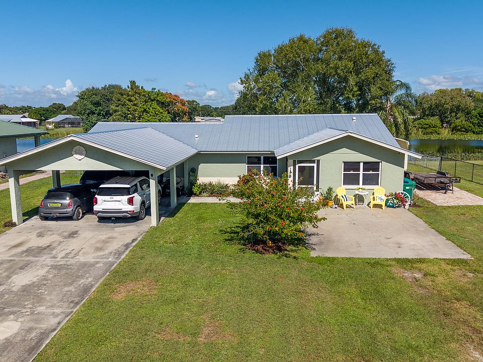 TAYLOR CREEK ISLES-$10,000 Seller's concessions being offered with full price offer!! Enjoy waterfront living in this 3 bdr 2 bth home with a METAL ROOF. 1490 living sq ft, 2660 total. Master suite has a walk-in closet and stunning water views.Freshly painted interior is ready for your personal touch. Spacious screened in back patio, above ground pool, fishing dock, fenced in backyard, storage shed, large, covered carport, osmosis water system, and canal sprinkler system. Expansive parking for boat or RV. Hookup for RV is complete. No HOA, city water and sewer, and hurricane panels provided.Measurements are approximate.