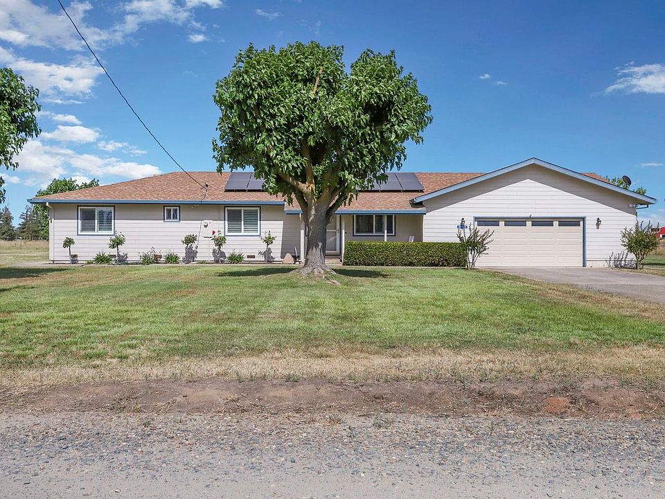 SUPER clean and charming three-bedroom two-bath home with hardie board siding, scraped hickory floors, Berber carpet, crown molding, upgraded blinds, can lighting, kitchen and baths updated a few years back and totally turn-key! Primary bedroom has 2 full sized closets, the other 2 bedrooms each have a big walk-ins! HUGE (Extra wide and deep) two-plus-car garage with a nice wall of cabinets - really must see this garage to appreciate the size! Five acres of fun, fenced for livestock, a neighboring cow is sometimes invited to provide mowing service! 20 by 40 SHOP BUILDING with tall rollup door to accommodate your RV. Water stubbed to shop and 30 amp service in place for your RV or other needs. Paid-for solar! Our Seller says no electric bill since the solar was installed. Well-maintained home and grounds, perfect "mini ranch"!!! Make it yours before it's gone...