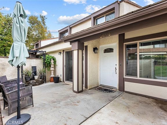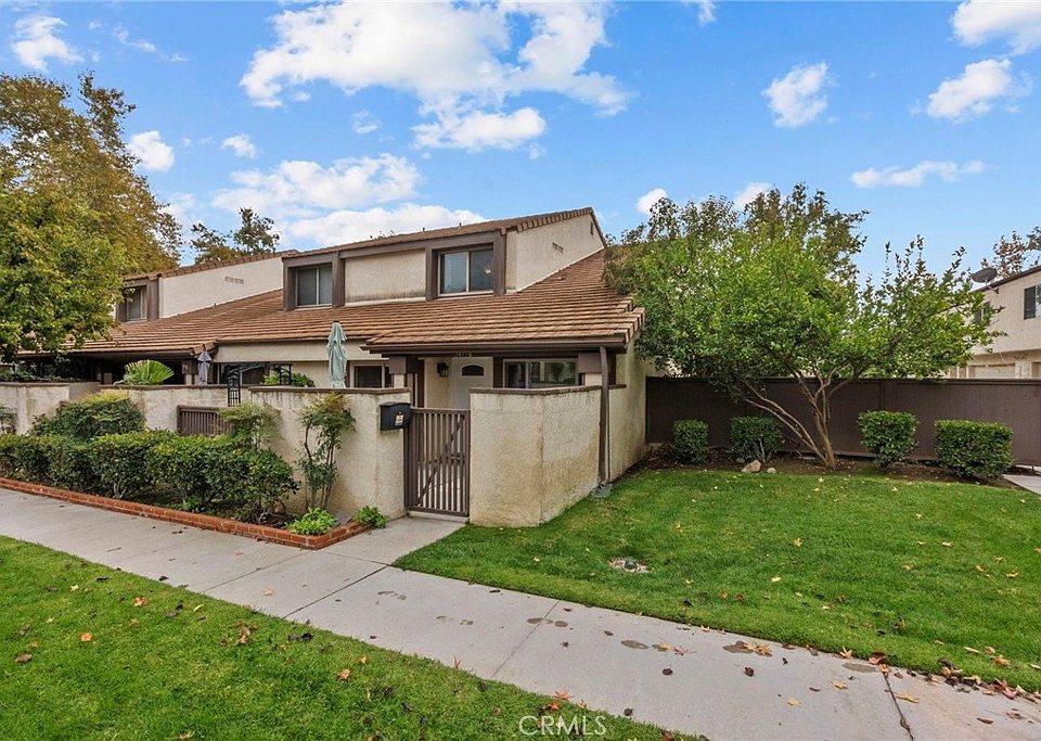 Welcome to this beautifully maintained end-unit 3-bedroom, 1.5-bath townhome in the highly sought-after Vista Fairways community of Valencia! Located just steps from one of the three community pools and backing the scenic Valencia Golf Course, this home offers privacy, convenience, and resort-style living. Step inside to vaulted ceilings, crown molding, and an office nook, with upgraded engineered wood flooring downstairs and plush carpet and tile upstairs. The kitchen features Samsung appliances, painted cabinets, while beautifully updated bathrooms, including a downstairs half bath, add modern comfort. Enjoy natural light from newer dual-pane windows and a sliding glass door leading to a partially covered private patio. The primary bedroom boasts a walk-in closet and included TV with wall mount, and the other 2 bedrooms features a built-in closet with custom paint. Additional upgrades include a finished garage with epoxy flooring, ample storage, attic access, newer vents and door knobs, a 3-year-old water heater, and a yearly-serviced HVAC system. Ring doorbell installed for added security. Perfectly situated near top-rated Meadows Elementry school, shopping, dining, California Institute of the Arts, College of the Canyons, and with easy access to the 5 Freeway, this meticulously cared-for home blends comfort, style, and convenience—move in and enjoy!