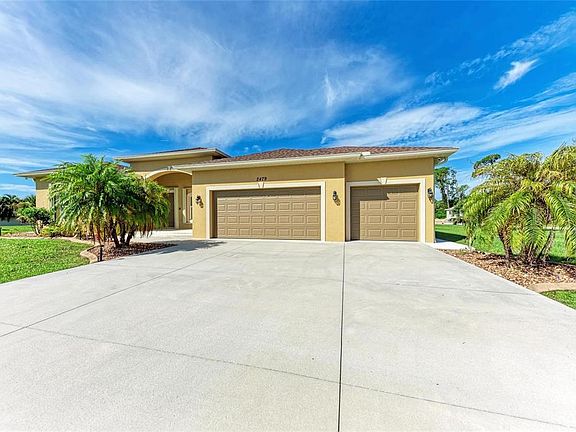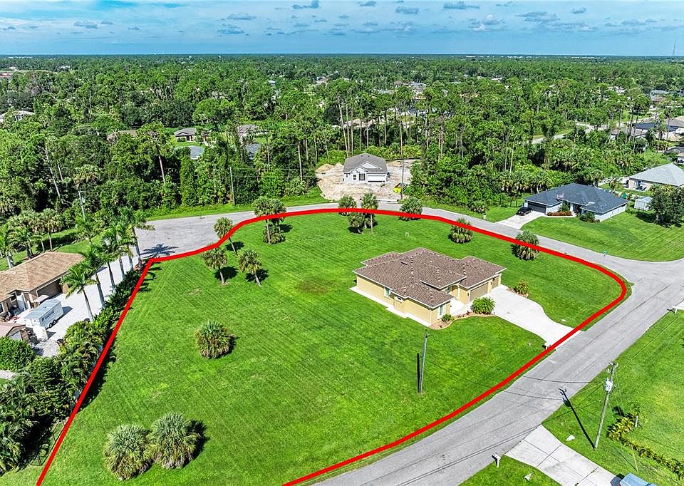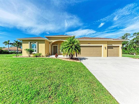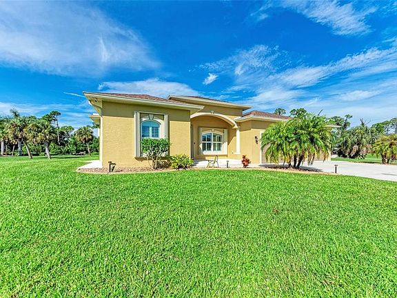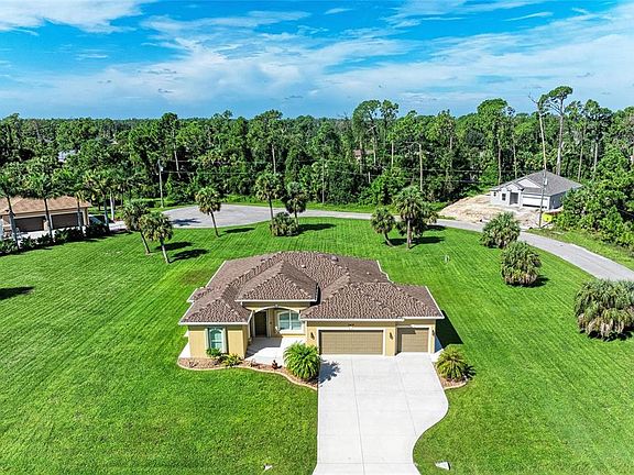 One or more photo(s) has been virtually staged. A Modern Retreat on a Rare 1-Acre Corner Lot Step into comfort, style, and peace of mind with this beautifully designed 3-bedroom, 2-bathroom + den home, built in 2019 and located on a spacious 1-acre corner lot outside the flood zone. From the moment you arrive, you’ll notice the meticulous attention to detail and quality craftsmanship throughout the property. The home features 10-foot ceilings, coffered and tray ceilings with crown molding, and arched windows that add architectural character and natural light. Wood-look porcelain tile runs throughout the entire home, offering both elegance and durability. The kitchen is both stylish and functional, featuring a Whirlpool fingerprint-resistant stainless appliance package (including a convection air-fry range), granite countertops, a tiled backsplash, and plantation shutters that tie the space together with charm. The living area showcases a coffered ceiling with crown molding and is finished with matching plantation shutters, creating a polished and welcoming space for relaxation or entertaining. The primary suite is a peaceful retreat with a coffered ceiling, his-and-hers walk-in closets, and a spa-like en-suite bathroom featuring granite counters, a linen closet, and plantation shutters for added privacy. Designed with comfort and practicality in mind, the home also includes a 3-car garage with epoxy floors, 200-amp electrical service, upgraded accordion hurricane shutters, and a cement walkway that wraps around the entire property for ease of access and maintenance. Step outside to enjoy Florida’s year-round sunshine in your extended under-roof lanai, ideal for outdoor dining or lounging in total privacy. The professionally landscaped yard includes decorative curbing with stone accents, a Wi-Fi-controlled irrigation system, and plenty of space to add a pool, detached garage, or garden oasis. Other smart home features include a Ring security system and Wi-Fi-enabled garage door controls for peace of mind wherever you are. Located in the growing city of North Port, this home places you close to natural attractions like Warm Mineral Springs, Myakkahatchee Creek Environmental Park, and endless opportunities for kayaking, hiking, and fishing. You'll also be just a short drive from CoolToday Park, Atwater Community Park, and the waterfront shops and dining of Wellen Park. The Gulf Coast's stunning beaches are also within easy reach. If you're looking for a move-in ready home with timeless style, smart upgrades, and plenty of room to grow this is it.