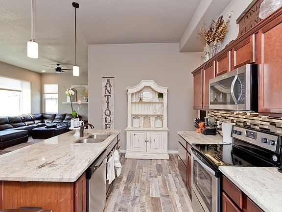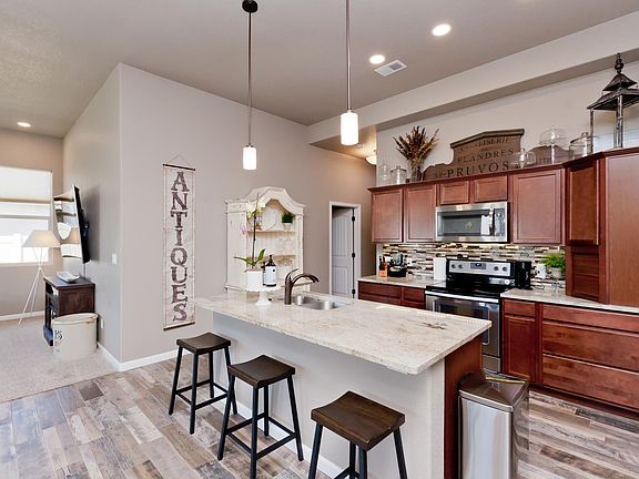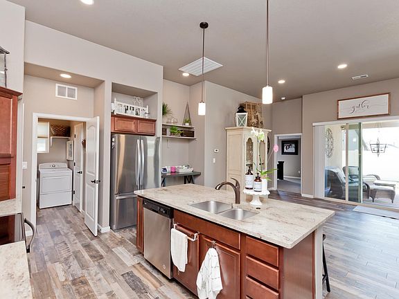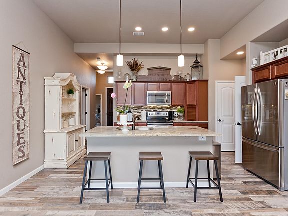 Striking stucco and stone ranch style home within the popular Heritage Heights subdivision. Built in 2018, better than new, with everything you need and a 3rd bath! Welcoming foyer with room to hang your coat and toss your keys. Two bedrooms share Jack and Jill bathroom, each w/private sink, toilet and closet. Tall ceilings and lots of windows allow light to flow throughout. Granite counters, mahogany colored cabinets and island complete a perfect kitchen. Large dining room allows for dinner at the table or even extra living space. Cozy nook near the kitchen for a desk. Laundry room and convenient 1/2 bath off garage. Spa master suite with walk-in closet, large double vanity and shower with stone-like tile and rain shower head. Relaxing covered patio. Privacy fence, room for a shed or hot tub. Central A/C. Immaculate! 3D virtual tour.