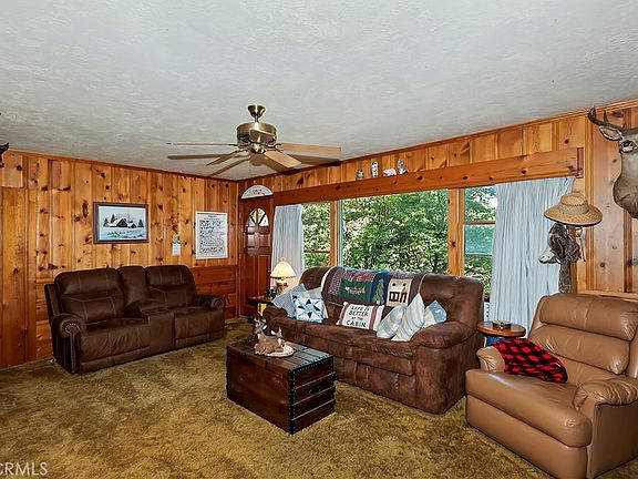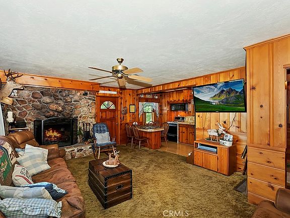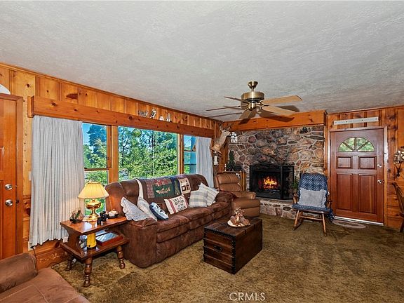 This darling cabin is being offered for sale completely furnished. It sits upslope on a unique natural rock landscaped 8,000 sf lot. It's in the middle of one of Crestlines finest neighborhood by has a real sense of privacy. You enter into a roomy living room with a real fireplace and door to the large front deck. The kitchen is to back of the house and overlooks the back yard. There are two sizable bedrooms and a 3/4 bath. The home has attractive real wood walls and a cozy comfortable feel. The property has been well taken of including both decks. The driveway has plenty of parking for four or more cars. This home is located on one of the most desirable neighborhoods in Crestline. It's moments to Lake Gregory, shopping and the library and Highway 18. Don't wait. You could be in your own cabin by Memorial Day.