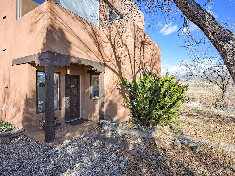 Discover classic Northern New Mexico charm in this beautifully maintained end-unit townhouse perfectly positioned between Arroyo Seco, the Town of Taos, and Taos Ski Valley. Warm architectural details—including vigas, Saltillo-style tile, carved wood accents, and hand-troweled plaster walls—give the home an inviting Southwestern character from the moment you step inside. The main level features a bright, open living area with large windows framing stunning mountain views, plus a cozy kiva-style fireplace that anchors the space. The adjacent kitchen offers generous counter space, natural wood cabinetry, and a built-in banco dining nook with sculpted adobe forms that echo traditional Taos design. A full bath with laundry adds convenient functionality on the first floor. Upstairs, both bedrooms are filled with natural light and offer access to outdoor spaces with views of the Sangre de Cristo range. The primary bedroom includes a spacious sunroom-style nook—ideal for a home office, reading area, or meditation retreat. A large second full bath with dual Talavera sinks completes the upper level. Outdoor living areas include a private walled courtyard off the kitchen and additional fenced space suitable for pets or gardening. A detached one-car carport adds covered parking and storage options. With only four units and no HOA or condo dues, this property offers rare tranquility with unbeatable proximity to skiing, hiking, dining, and the vibrant culture of Taos and Arroyo Seco. A wonderful opportunity to enjoy the best of Northern New Mexico living.