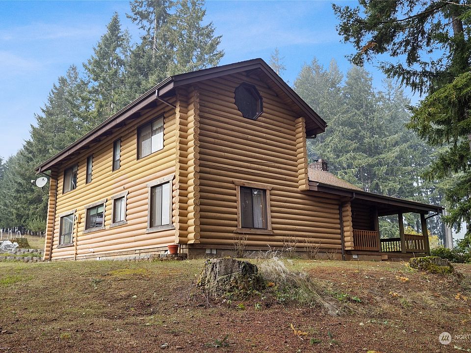 Rare find one of a kind custom built log home. One and a half stories with 3 bedrooms and 1.75 baths. The Main floor features spacious Great room with Black Lava Fireplace with wood insert, Kitchen, Dining area, Utility, one Bedroom and a 3/4 Bath. Vaulted ceilings throughout. Upper level has a balcony overlooking the Great room, Primary bedroom, Jack and Jill bath and another bedroom. Both upper bedrooms feature walk in closets. Custom trim, handmade stair railings and solid etched wood doors throughout. Forced air heating. Pole barn with 3 stalls and horse pasture. Double car garage and RV Parking. Individual well and septic. Two parcels with 2.04 Acres. Sale is AS IS seller will do NO repairs.