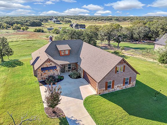 Stunning single-story, like-new custom-built John Schedcik home on 1 acre in highly rated Paradise ISD, offering beautiful wooded views. The exterior boasts striking Oklahoma multicolored cut stone and rock for timeless curb appeal. Inside, the gourmet kitchen features stainless steel appliances, granite countertops, decorative lighting above the island and breakfast nook, and the refrigerator stays. A formal dining room showcases a coordinating chandelier, while the living room highlights tall vaulted ceilings, a floor-to-ceiling stone fireplace, built-in cabinets, and cozy built in seating. The spacious primary suite offers tray ceilings with wood accents, windows for natural light, and a luxurious ensuite with a walk-in shower, freestanding tub with frosted window, dual vanities, built-in cabinetry, and expansive walk-in closet with shelving. Two additional bedrooms provide flexibility for family or guests. Ceramic wood-look tile and carpet flow seamlessly throughout, complemented by energy-efficient argon windows for comfort and savings. The insulated garage adds practicality, and foam installation throughout and installed 31 piers under home during construction based on engineers recommendation. Outdoors, the large backyard features an extended covered patio—perfect for relaxing or entertaining.