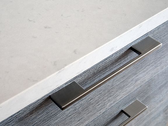 -Custom Scavolini vanities in iron grey and humus oak, with caesarstone countertops in Misty Carrera