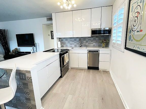 Light and Bright Condo in a vibrant 55+ community, Century Village. With a fully remodeled interior, you feel right at home when you walk through the door of your modern oasis. This condo is situated alongside the lake. Century Village has many birds and wildlife you can view through your screened-in terrace. Four closets provide ample storage space. The remodeled kitchen has top-of-the-line appliances, extremely durable quartz countertop, high gloss lacquer cabinets that create a luxurious look as well as decorative light fixtures. Removing the wall has created an open concept floorplan, which is great for entertaining. All renovations were professionally permitted. Grey wood look flooring is brightly colored but creates a warm and inviting feel. Central A/C for hot summer days and fans in both bedrooms. Can be sold furnished with all designer furniture from Brazil. All furniture and accessories were purchased from Artefacto.