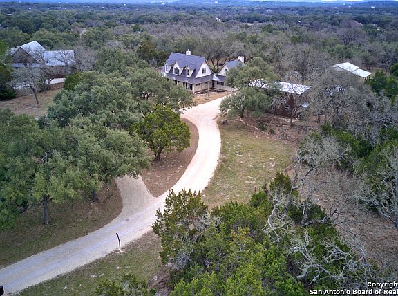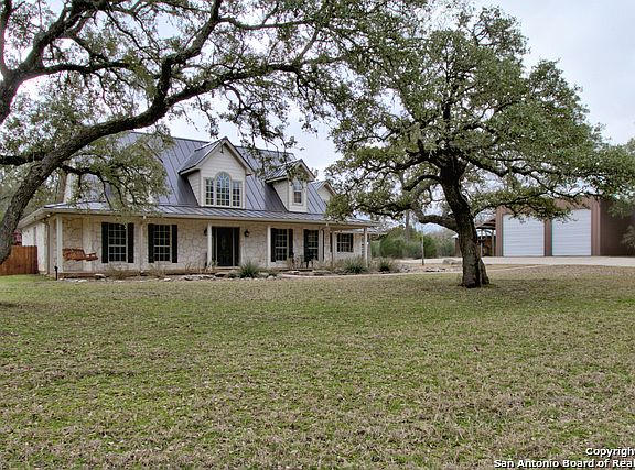 Outstanding home on 5 acres! Brand new metal roof and gutters! Wrap around covered porch! Recent updating including all bathroooms! Big game room with fireplace, wet bar and built-ins! Pool, outdoor kitchen! 25x40 & 30x40 barns for covered parking, RV, boats and toy storage! Security cameras! Detached duplex offices with heat and air! Smoke house! Insulated well house w/water softener! Fenced and cross-fenced! Fenced garden w/water!Sprlk sys! All this and an HOA park on the Guadalupe River with RV hookups!