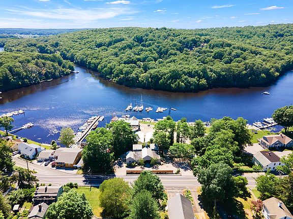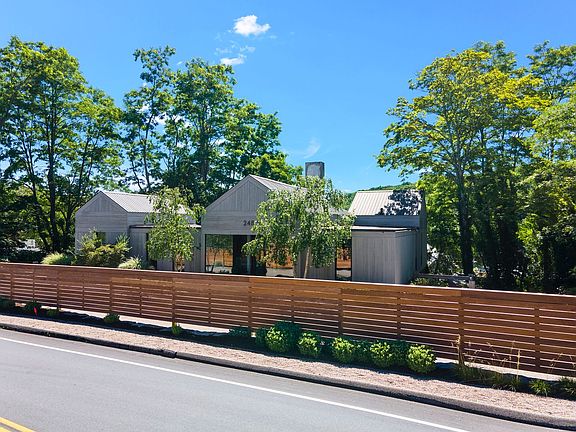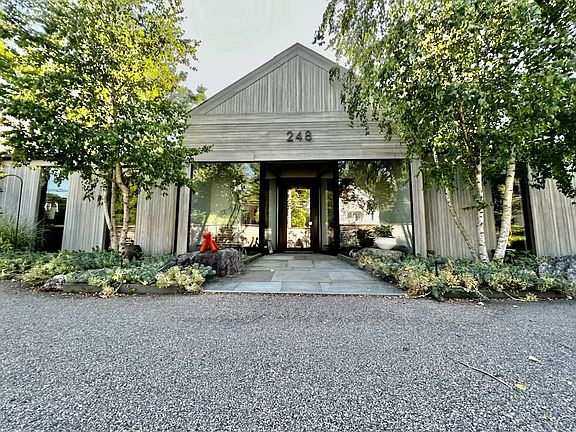 A very stylish contemporary building that was once an art gallery and an Antique store! Behind the entrance foyer find an expansive great room with high beamed ceiling and views of Hamburg Cove and Cove Landing marina. A gas fireplace is flanked by floor to ceiling sliders which open to a massive deck overlooking the water. A dining room is open to the great room and is accented by a coffee or cocktail bar which is a lovely gathering place for small social groups or large crowds. The bedrooms are sunny with soaring ceilings, huge windows and hidden sliding walls to close them off from the public spaces. The modern kitchen is complete with a wall of pantry space and a seperate entrance for catered events. Both the entrance to the home and both bathrooms are handicapped accessible. There is also a large office with a built-in desk and shelving.