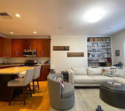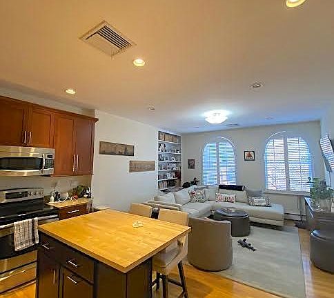 Nicely renovated front facing 1 bed. Sunny top floor. Open granite/stainless kitchen. Central Air Conditioning. Custom windows & shudders. Walk-in closet. Hardwood floors throughout. Views of charming Marlborough St. In a well managed building with laundry. Available June 1...possibly May. Heat & hot/cold water included. First, last, $200 key & one month broker fee. Cats allowed(2 max).