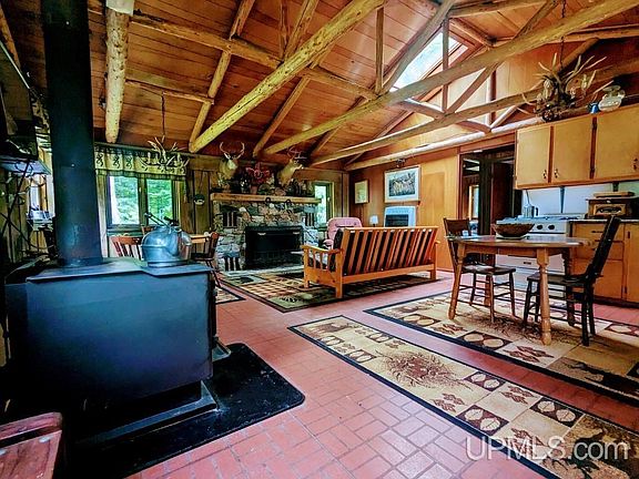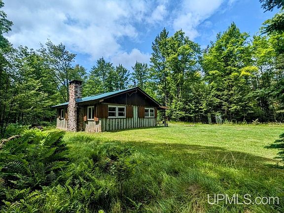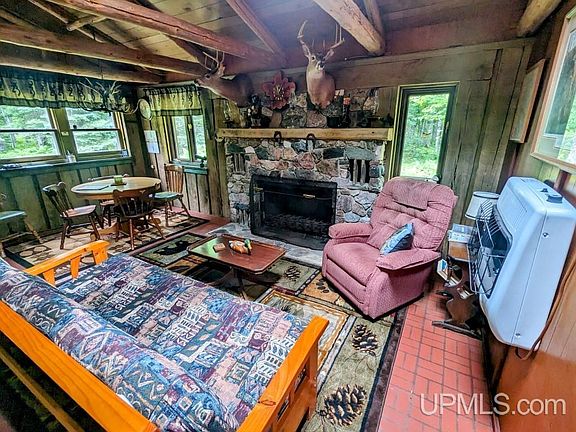 Have you been dreaming about having your own log cabin camp? This vertical log , metal roofed camp features a drilled well, tiled bath, propane wall furnace as well as a wood stove, on-demand hot water, propane oven and refrigerator and a 3500 watt generator for electric power. The natural stone fireplace and massive beam mantel hearkens back to classic hunting camps, yet this place was built in the 80s. There's Anderson windows everywhere and a skylight to let the nature-al light in throughout. Outside there's a 24'x36' metal pole building with cement floor for plenty of room to keep your toys out of the weather as well as a smaller shed the current owner used to house his "wildlife feed". Quality deer, turkey, grouse and bear hunting in the area with a great box-blind already in place to start this fall season. All located on just over 40 acres with 100s of acres of State of Michigan and CFA lands to the north and south so you won't feel crowded. Roads and trails will take you through 1000s of acres south of Lake Mary and north of the Peavy Pond, both with fantastic fishing and water recreating. Just 10 minutes from Crystal Falls and 40 minutes from Iron Mountain. Log cabins in locations like this don't come around very often.