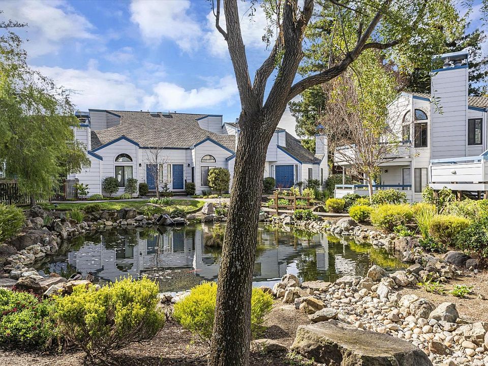 Location! Location! Location! Totally remodeled end unit townhome in desirable Windsor Lochs complex. The entire exterior has been freshly repainted, and a brand-new roof has been installed, improving both durability and curb appeal. Formal entry with parquet wood floors & step-down living room w/ fireplace. Separate dining room w/ French doors to a private linear deck that overlooks the common area. Open eat-in kitchen with brand new countertop and cabinets, brand new hood and stove, newer dishwasher and refrigerator, garden window and ample cabinet space. Separate laundry room with full size washer & dryer hook-up. 1st floor bedroom / office with double door entry & view of the common area lake. Huge master suite with vaulted ceiling, double mirrored closet doors & brand new wood floors. Master bath w/ deep soaking tub, double vanity sink, separate stall shower. Generous size 3rd bedroom. Large attached garage with automatic door opener and extra storage space. Beautifully maintained complex with swimming pool and lake. Convenient to shopping, Google, downtown Mountain View, freeway and expressway access. Don't Miss It!