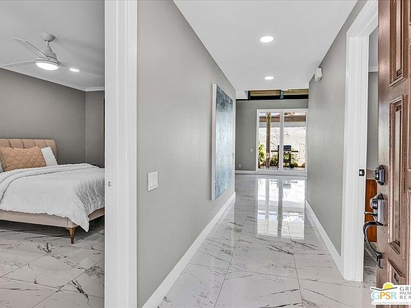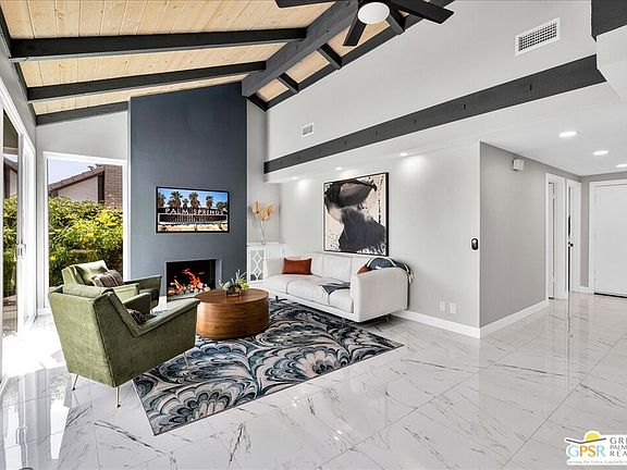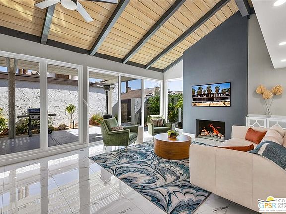 They say there is no perfect house. That may be true, but this two bedroom, two bath, two car garage single detached bungalow in south Palm Springs surely comes close! Every inch of this home as been upgraded and remodeled with quality materials. Pride in ownership is evident from the moment you enter this turnkey furnished home. Stainless steel appliances; gas stove and oven; large white tile flooring and recessed lighting throughout. The updated kitchen overlooks a private patio with space heater and Weber barbeque. Floor to ceiling dual pane sliders keeps the heat out, but allows for plenty of sunshine. There is a private atrium off of the main bathroom. The floor to ceiling fireplace has been updated to a more modern look with an enclosed television. The complex is well-maintained with tennis and pickleball courts; seven pools and spas all in a park like setting. There is an onsite management office. Only minutes to PSP and downtown and across from Von's shopping center. Perfect for your own desert escape or a great investment opportunity. Thirty day minimum on vacation rentals. Additional guest parking within the community. This home truly is a must see!