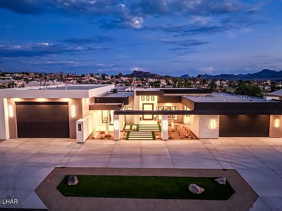 Modern Luxury in Residential Estates! This stunning contemporary home showcases exceptional curb appeal with a U-shaped driveway, modern concrete step and tile entry, lush turf accents, elevated desert landscaping, and landscape lighting in both the front and rear to highlight the home's architecture and outdoor living spaces. A striking iron pivot entry door sets the tone for the luxury found throughout. Located in the highly sought-after Residential Estates—with natural gas and underground utilities—this residence delivers both luxury and convenience. Expansive windows fill the interior with beautiful natural light, enhancing the home's warm, modern aesthetic and seamless indoor-outdoor living experience. Designed for the ultimate Havasu lifestyle, this 4 bedroom, 5 bath home features an impressive 29' x 70' RV garage plus an oversized 2-car garage with a 9' door. The RV garage includes a half bath with exterior access, doubling perfectly as the pool bath. The backyard is a private resort oasis featuring rear patio pavers, a sparkling pool, infinity-edge spa, built-in fire pit, outdoor kitchen, and captivating rear lake and golf course views- ideal for both daytime enjoyment and evening ambiance. Inside, high-end finishes elevate every room. The home is wired for smart-home tech and crafted for effortless entertaining. The gourmet kitchen, positioned at the back of the home overlooking the pool, boasts a butler's pantry, built-in side-by-side refrigerator/freezer, 48" gas range, built-in under-counter microwave, and custom cabinetry throughout. The primary suite offers direct pool access and a spa-like bath with a freestanding tub, gorgeous walk-in shower, and spacious walk-in closet. A junior suite with its own private courtyard entrance provides ideal privacy for guests. Luxury, design, and function blend beautifully in this one-of-a-kind Havasu home truly a must-see!