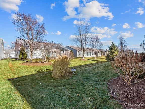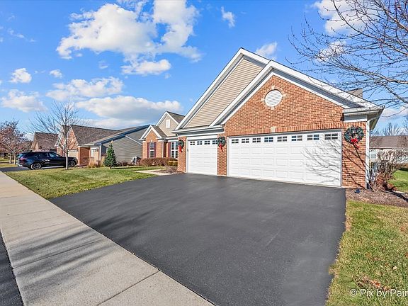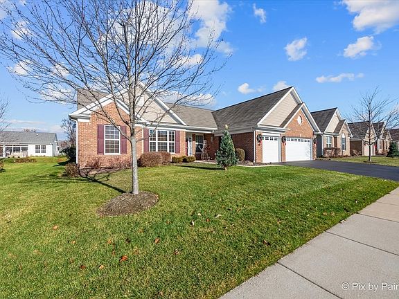 Welcome to this stunning Crystal model Ranch located in the desirable Edgewater by Del Webb community of Elgin. This beautifully designed home offers an array of features & amenities that are sure to impress. You will love the spacious & open floor plan that is perfect for both entertaining & relaxation. The large gourmet kitchen has SS appliances, gorgeous Cambria quartz countertops, Custom 42' cabinets, tiled backsplash, a convenient breakfast bar & separate eating area. The adjacent dining area & den are ideal for hosting family & friends. The highlight of this home is the large Master suite with tray ceiling, large walk-in closet, luxury bath with soaking tub, separate shower & double vanity. The additional 2 bedrooms are equally spacious & provide plenty of room for guests or a home office. Outside you will enjoy your large brick paver patio with a screen for shade & privacy, ceiling fan with light, speakers & a gas hookup for your grill. Professional landscaping with dozens of perennials surround the property with beauty. The garage has been recently finished with plenty of storage space. The beautiful Edgewater community of Del Webb presents an idyllic setting for those yearning for an active adult, resort-style living experience. This neighborhood is designed for low-maintenance living, providing its residents ample time to indulge in the array of activities and amenities available within the community. This is a must see!
