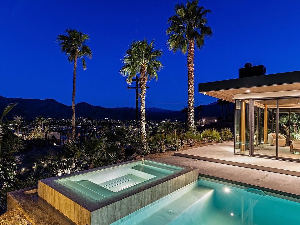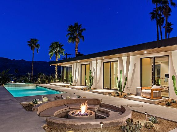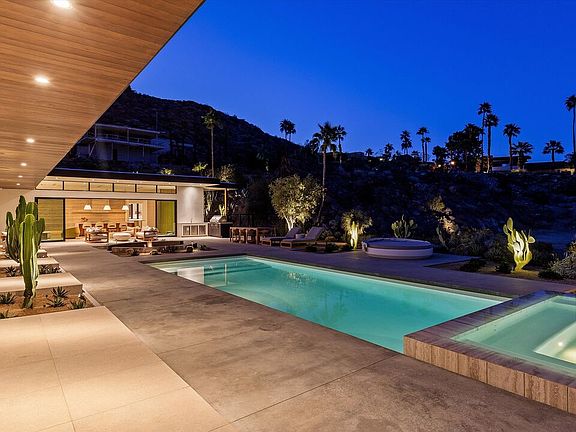 Sometimes, when presenting a property to market, there are so many exceptional features that it's hard to know where to begin, and this renovation just completed in 2025 is a perfect example. In this case, every aspect of living and entertaining at home has been thoughtfully considered, with a design that not only embraces but becomes one with its natural surroundings. For starters, the site itself is breathtaking, a spectacular setting that elevates this L-shaped modern home above the desert floor, offering seemingly endless mountain views and dramatic city lights. The architecture is deeply connected to the landscape, seamlessly integrating with the rugged terrain that so profoundly inspired the principles of desert modernism. This is a home that doesn't just sit on the land, it belongs to it. Inside, the open floor plan is an architectural dream, featuring an "invisible" kitchen with a large island and a striking natural stone wall. The interiors create a tonal and textured atmosphere, seamlessly blending organic materials that bring warmth to the modern aesthetic. Every detail has been designed to honor the desert environment, from the earthy color palette to the strategic placement of glass that frames nature like artwork. A hidden butler's kitchen sits behind the great room, with a galley of counter space and storage leading to what may be the most incredible laundry/mudroom we've ever seen. The integration of style and function throughout the home is next-level. On the other side of the house, a long hallway connects three ensuite guest bedrooms, a spacious den/media room, a gym, an office, and a powder room. A spa-style bathroom, complete with a steam shower, serves both the gym and the pool. And at the very end of this wing? The crown jewel: the primary bedroom suite. Wrapped in glass with a see-through fireplace and perched dramatically on the edge of the mountain, this is unlike any bedroom experience in Palm Springs, one where you wake up immersed in the landscape itself. Brand-new Monumental doors and windows dissolve the boundary between indoors and out, leading to a sunken concrete seating area with a fire pit, a swimming pool with a raised infinity spa, and a built-in BBQ with a sink. The outdoor spaces feel like a natural extension of the home, reinforcing the seamless connection between architecture and environment. And did we mention the forever views? Owned solar and all-new systems provide a highly efficient approach to desert modernism. A two-car carport with electric charging stations further enhances the home's sustainability. Truly one of a kind, this dramatic hillside property is the ultimate expression of the Palm Springs experience where modern design and the raw beauty of the desert exist in perfect harmony.