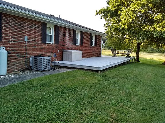 Brick ranch home with 2 bedrooms 1 bath with separate laundry room. Complete remodel in 2018. HVAC unit and brick fireplace with gas logs. Large living room with 10 feet ceiling. 60' wraparound deck. Level yard with large trees. Hewed rock cellar. Picnic shelter beside above ground pool. 600 square foot storage building insulated and heated. 1800 square foot concrete block detached garage insulated and heated. 7 acres of rolling grassland with pond and creek. Only a short walk to Mill Creek Game Reserve.