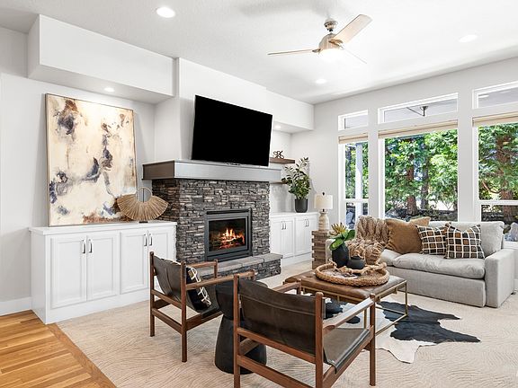 Welcome to Lakemoor - Eagle’s premier gated community with lush greenbelts, fishing ponds, pools, tennis, pickleball and basketball courts & direct access to The Bridges at Lakemoor shopping and dining. This stunning 1,926 sq ft single level home offers 3 beds, 2 full baths, and a 2 car epoxied garage with ample storage. Soaring 10' ceilings, large windows, and real hardwood floors create a bright, upscale feel. The open layout features a gas fireplace with built-ins, designer lighting, and a chef’s kitchen with granite counters, stainless appliances, alder cabinetry, and walk in pantry. The split bedroom design includes a luxurious primary suite with dual vanities, a large fully tiled walk in shower, soaker tub, and huge custom designed closet. High efficiency furnace, conditioned crawl space, and exceptional attention to detail throughout, plus a laundry room with sink, counters, cabinets & storage. Lock-and-leave lifestyle with upscale amenities in one of the Valley’s most sought after locations!