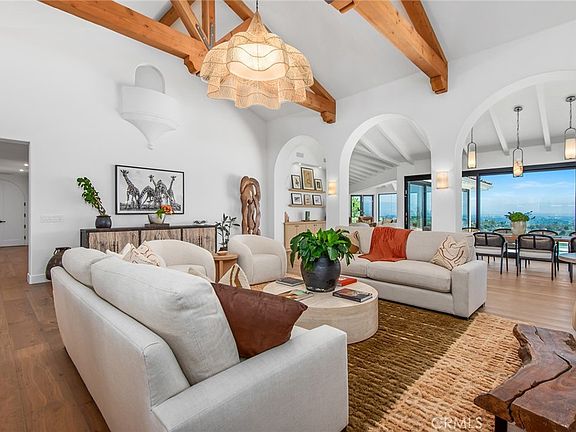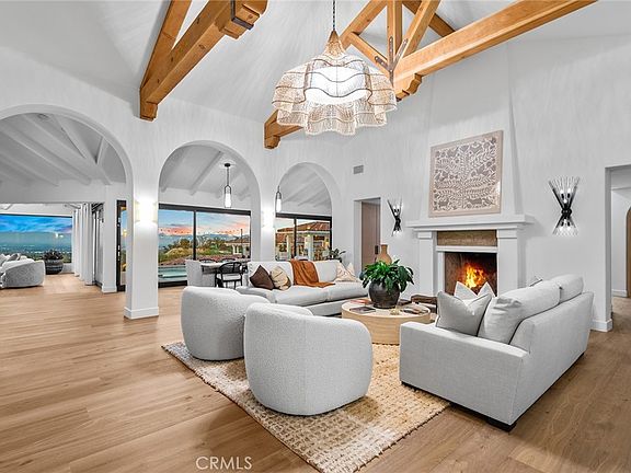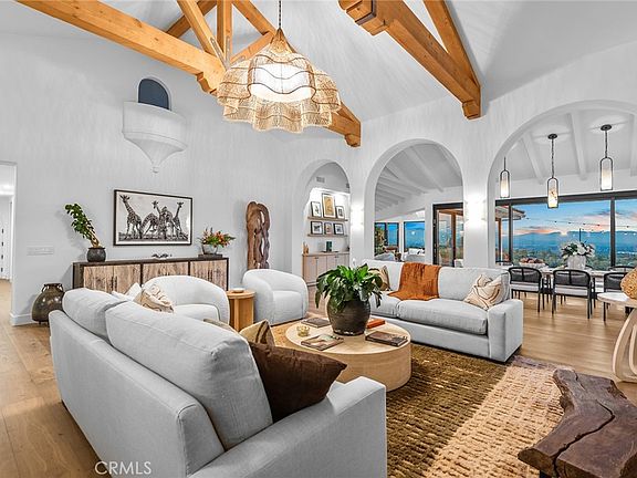 Price improvement! Spectacular views highlight this stunning, model sharp one-story estate. Recently finished and completely reimagined from top to bottom, highlights include a brand new chef's kitchen with Wolf and Sub-Zero appliances, opening to the spacious family room with sliding walls of glass, living room with an architectural open beam ceiling, large game room, loft office, and a gorgeous bar/lounge showcasing the panoramic views. There are four bedroom suites in the main house, each with French doors to the garden and all with brand new baths, including the beautiful primary suite with dual baths (one with a soaking tub and one with a steam shower), plus dual custom closets, and a private patio with a spa tub nestled amongst the trees. There is also a beautiful guest house with a new kitchen & bath, and a separate gym with full bath, custom sauna, steam shower, and a Tonal workout system. The drought tolerant, lushly landscaped and very private grounds include a sparkling spa & pool with Badu swim jets, a large covered patio with fireplace, barbecue pavilion with T.V. center, patio dining area & counter seating, limestone fountains, additional seating area with firepit, play yard with swing set, in-ground trampoline and putting green, new synthetic turf, and a mature fruit orchard with citrus & avocado trees. Additional amenities include all new Dutch, White Oak flooring and White Oak cabinets, all new window coverings, a Control 4 Home Automation system, a Martin Logan home theater system with built-in speakers for the family room, three "Clear Ice" icemakers (kitchen, bar, BBQ cabana), a whole house Halo water purification system, indoor & outdoor sound system, security system complete with 16 cameras, all new T.V.'s, plus a back-up generator, new roof, a large chicken coop and approval for a future barn. The total square footage shown includes the main house, the guest house, and the detached gym.