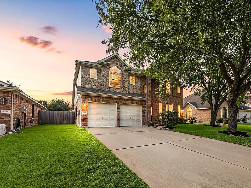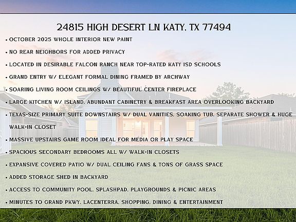 This beautifully maintained 2-story in Falcon Ranch offers, OCT/2025 WHOLE HOME PAINT, NO REAR NEIGHBORS, plus a bright layout near top-rated Katy schools. A grand entry welcomes you into an elegant formal dining framed by an archway, while the soaring living room ceilings hosts a cozy center fireplace. The large kitchen impresses w/ abundant cabinetry, island workspace & generous breakfast area overlooking the backyard. The Texas-size primary suite is downstairs, featuring dual vanities, soaking tub, separate shower & huge walk-in closet. Upstairs, enjoy a massive game room, airy open-to-below views & three oversized secondary bedrooms w/ walk-in closets. Outdoor living shines w/ an expansive covered patio featuring dual ceiling fans, tons of green space & an added storage shed. Residents enjoy a community pool, splashpad, playgrounds & picnic areas—all minutes to Grand Pkwy, LaCenterra & major shopping/dining. A true move-in-ready gem offering comfort, privacy & space!