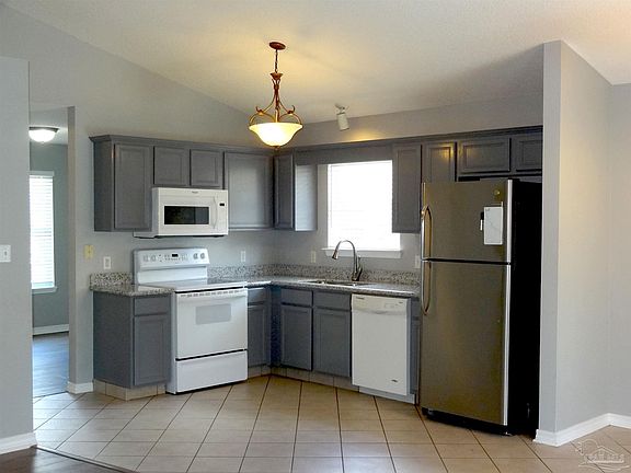 ***This brick veneer and vinyl sided home is ready and awaiting you as its new owner(s). Located in West Pensacola this home is situated off Gulf Beach Highway in an established subdivision. An ideal location close to Navy bases, Perdido Key with its beautiful beaches, shopping and down town Pensacola. As you enter the home from the front porch you will find a contemporary open airy floor plan in this inviting, functional, 3 bedroom & 2 full bath floor plan. The interior of the home has been freshly painted with a soothing pallet. There is Luxury Vinyl Plank (LVP) flooring throughout the main living areas with tile flooring in the wet areas of the foyer, kitchen, laundry room and baths. The spacious great room with its cathedral ceiling is bright and sunny with LVP flooring. The kitchen has freshly painted grey cabinets with new contemporary granite counter tops, deep kitchen sink and faucet. Both kitchen and great room overlook the patio/back yard with its fenced back yard and other sitting areas with a fire pit. There is a separate formal dining room for family dinners and entertaining. The master bedroom with an on suite master bath has new granite vanity top, faucet, freshly painted grey cabinets and a walk-in closet. A few more of the other little extras include: A dimensional roof installed, permit was pulled September 25, 2017 as per county records, and a new gas hot water heater in Nov 2019. Parking is not a problem with a 2 car garage. Check out this property, well worth waiting for! The information as to size and year built were taken from the Property Appraiser Site. The buyer(s) is to satisfy them self/themselves as to the exact size, all property amenities/information or any other items they deem important. This home is currently priced well for today’s market conditions.