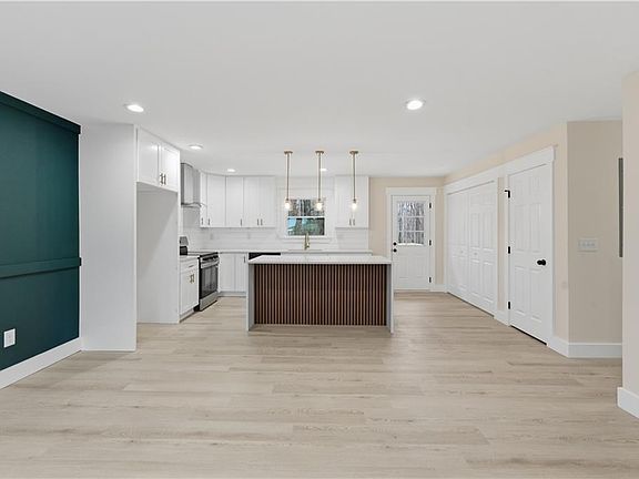 - Features: Cabinets White, Kitchen Island, Stone Counters, View to Family Room
