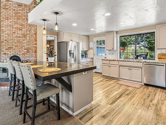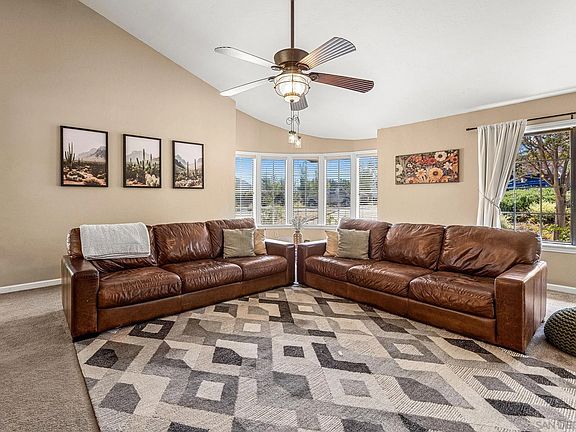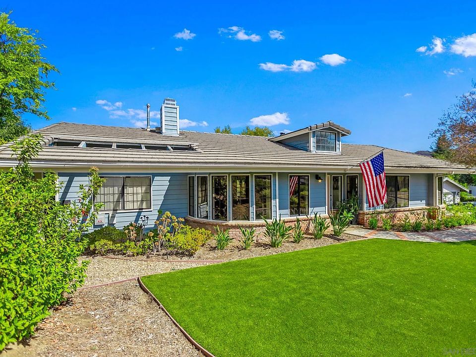 Updated, single-story home in San Diego Country Estates. This comfortable home boasts large living and family room areas filled with windows, offering abundant natural light. Both rooms feature fireplaces: a traditional fireplace in the living room, a wood-burning stove with a floor-to-ceiling hearth in the family room. The kitchen opens to the family room, with counter bar seating, ample storage, and access to the dining room and outdoor patio. Three spacious bedrooms, two baths, and a laundry room complete the home. Multiple exterior doors lead out to a large elevated patio, perfect for entertaining or dining al fresco! Unique to the area, this home's driveway wraps below the patio, connecting to a massive two-car garage with an attached 23-foot-deep RV garage. This space is perfect for additional storage, a shop, or storing a boat or RV! The home also includes a paid solar system, providing low to no-cost energy. At just over half an acre, the property features a huge, fully fenced backyard with the space and potential for an additional ADU or private pool. The home is within walking distance to James Dukes Elementary and 10-15 minutes from downtown Ramona. Experience all that San Diego Country Estates has to offer, including the clubhouse with a restaurant, sports bar, event space, boutique hotel, 18-hole golf course, tennis/pickleball courts, and a community pool and spa. The community also provides a vast trail system for horse riding, biking, or hiking, and a 5-acre community park with a second pool, a bandstand, and grassy areas for picnics and community events.