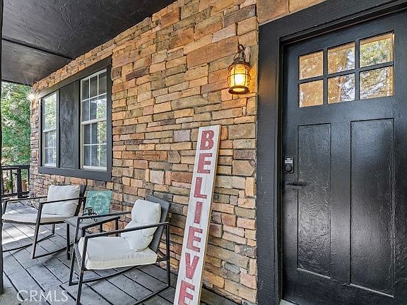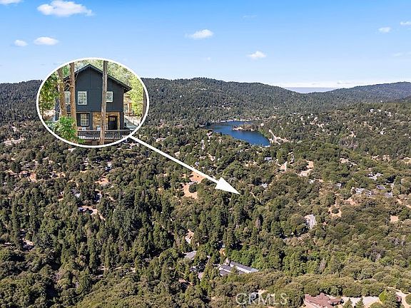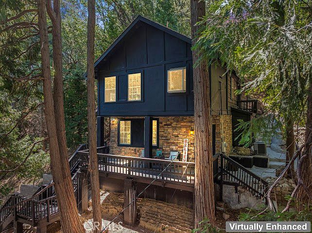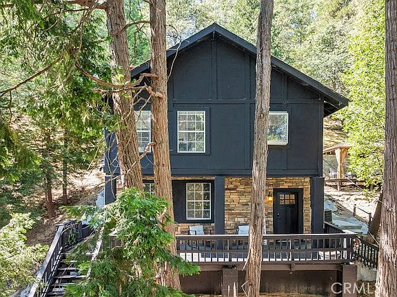 Property boast tranquility with amazing forrest views. Large front wood deck perfect for relaxing, was recently re-enforced. Mountain living at is best! Lake during the summer and snow in the winter. 1st level offers a large bedroom with ship lap wood accent wall, and a step down level perfect for a seating area/retreat. Can also be used as a home office. The upstairs level welcomes you with an updated staircase featuring spanish style accent tiles. The living room comes with a cozy white washed stone fireplace, perfect for those snowy nights. Freshly painted walls, wood decorative shiplap ceilings and terra cota tile floors through out. Off of the living room is the kitchen, open to the dining room area with a built-in curio. Upgraded kitchen with quartz counter tops, spanish & subway backsplash and farmhouse style sink overlooking the garden window. Kitchen also offers a pantry for lots of storage and will include the stove. The primary suite is also located on this level with two separate closets, and attached bath. Second hall guest bathroom with laundry area. Beautiful chandeliers & ceiling fans through out. Home also has a central HVAC system. Modern dual pane windows as well. Rear yard has a custom wood deck with a canopy for additional seating to enjoy the views. Beautiful curb appeal with two separate staircase entrance, stone accent. Exterior of the home was also painted 2 years ago. Property is in the San Moritz community close to Lake Gregory. And a short 15 min drive to lake arrowhead, or 20 minute drive back down to the city. NO HOA's & low property taxes.