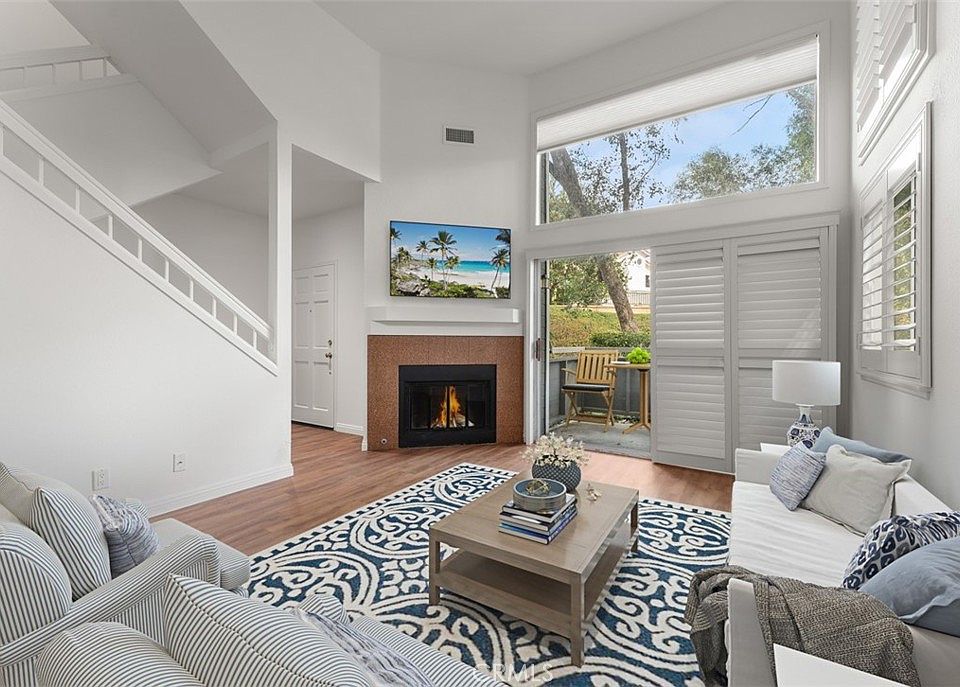 Discover your serene retreat in this beautifully updated stylish 2-bedroom end-unit townhouse, perfectly nestled in the heart of Laguna Niguel. Bathed in natural light, this home features soaring vaulted ceilings and picturesque views of lush trees and scenic walking trails. The unique open-concept floor plan flows effortlessly, showcasing a cozy fireplace in the inviting living area and a modern kitchen designed for culinary enthusiasts. The kitchen boasts sleek stainless steel appliances, stunning stone countertops, and a tumbled travertine backsplash, complemented by elegant shaker-style maple cabinets. Enjoy sunlit mornings in the charming eat-in dining nook with a bay window.