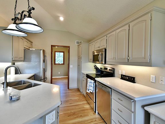 Stunning gray steel siding welcomes you to this rambler in great neighborhood. Beautifully maintained with many main floor updates including quartz countertops in kitchen & luxury vinyl plank flooring. Nicely landscaped. Main level living with 3 bedrooms and laundry on main. Great room in lower level and 2 additional bedrooms with gorgeous tiled bathroom, double sinks & jetted tub. Small finished lower level room - could be exercise room or office. Enjoy your spacious backyard with tranquil pond view on your treks decking. Rock retaining wall at pond. Pond is about 4' deep, can be used for hockey in the winter, paddle boat in summer. Central Monticello location near many restaurants, schools, parks, churches.