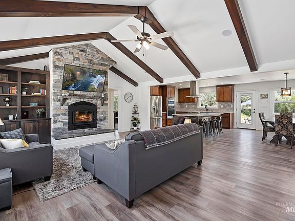 WOW! Live the Idaho dream on 1.12 acres of land right in NE Twin Falls. Located by the Snake River Canyon and the Canyon Rim Trail walking path. 4 Beds, 3 Baths + Office & 2 Living Spaces. 2696 sq ft. 3 Car Garage. Beautiful kitchen with all the appliances, granite countertops & LVP flooring. Large greatroom with vaulted ceiling, decorative beams and a premium Quadra-Fire Pioneer III wood burning fireplace system with smart burn technology. Master bedroom suite on main level with tile shower & soaker tub. Built in speaker system throughout the home. Private backyard with an active stream / water feature to enjoy. Comes with 1.13 water shares of Twin Falls Canal Company water. Bring the chickens! Lots of room to grow with this property. Built in 2022, this home feels brand new and is move in ready! Setup a showing of this dream property today and start enjoying all Idaho has to offer.