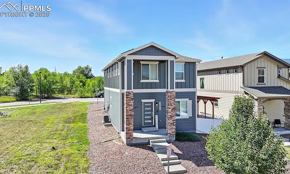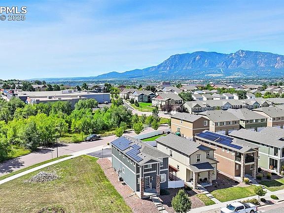 MOVE-IN READY 4BR/4BA 2-story home in the desirable Spring Creek Traditional Neighborhood of Colorado Springs. Situated on a corner lot with stunning mountain views, this home features a xeriscaped yard with green space on the side and a fenced backyard with auto sprinklers, concrete patio, covered pergola, and storage shed, perfect for outdoor entertaining. Step inside through a contemporary front door to an open floor plan with vaulted ceilings and brand new LVP flooring throughout the main level. The spacious Living Room flows into the Dining Room with walk-out access to the backyard. The Kitchen boasts dark wood cabinets, granite countertops, a pantry, and stainless steel appliances including a 5-burner smooth top range, microwave, dishwasher, and French door refrigerator. There is a Powder Bathroom and garage access conveniently located off the Kitchen. Upstairs includes a Loft (ideal for home office), Laundry Room with washer/dryer, and 3 carpeted Bedrooms with walk-in closets. The Primary Suite offers a private Shower Bathroom with dual sink vanity, tiled walk-in shower, and tile flooring. Two additional Bedrooms share a full Bathroom with dual sinks and tiled tub/shower. The Finished Basement features a large carpeted Family Room, 4th Bedroom with walk-in closet, and full Bathroom. Central air, solar heat (paid off at closing), and ceiling fans provide year-round comfort. Paid off security system with outdoor video for extra peace of mind (buyer's pay for service). 2-car attached garage with built-in storage. Close to schools, parks, shopping, and easy commute to Fort Carson and downtown Colorado Springs. A must-see home with modern amenities and unbeatable location!