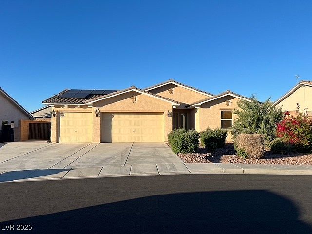 Truly unique semi-custom single story home with RV parking in Bilbray Ranch in Laughlin! As you enter the home, you are greeted with a dramatic entry with an open floor plan. Chef's kitchen is a masterpiece boasting custom cabinets, granite counters, breakfast bar, dining area, white appliances overlooking the living room great for entertaining. Laundry room with cabinets. 3 bedrooms and 2 bathrooms. The primary bedroom is showcasing the primary bath with a huge walk-in closet, soaking tub, shower and double sinks. Oversized 3 car garage. Resort style backyard oasis with a pool, covered patio w/shades, trees! The whole backyard is completely fenced with privacy fencing.