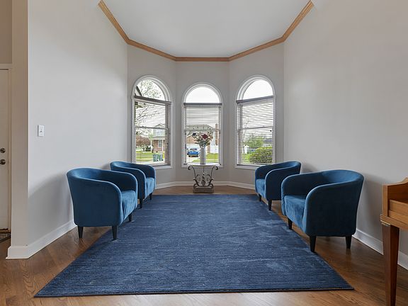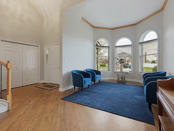 Spectacular 4 bedroom custom two story in fabulous Ridgefield Estates! Features include dramatic entry with soaring beamed ceilings and hardwood floor! Living room includes elevated octagon ceiling, oversized windows with transoms and crown molding! Well designed kitchen with hardwood floor, stainless steels appliances and service door to the deck! Flowing family room with high quality carpet, raised wainscoting, trimmed fireplace and ceiling fan! Primary bedroom with double door entry, trey ceiling, walk in closet and ceiling fan! Primary bath includes whirlpool, separate shower and dual sinks! Three additional upper level bedrooms and full bath with skylight! Finished basement with recreation room, game area, office/playroom/potential bedroom, dry bar, storage room, fireplace and recessed lighting! Main level laundry room with cabinets! Main level powder room! Heated three car side-load garage with retractable screened service door! Professionally landscaped fenced yard with large deck, and shed! White 6 panel doors and trim! Walking distance to school! Hurry!