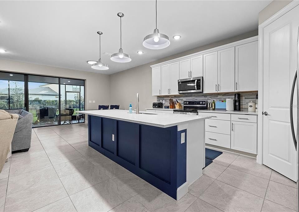 Expansive quartz countertopsShaker cabinetsFriendly island